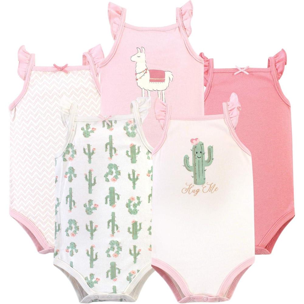 Hudson Baby 5-Pack Hanging Bodysuits are cute baby clothes of 100% lightweight cotton for the softest touch on your baby's gentle skin. Bodysuits are essential to any baby's wardrobe, and these bodysuits are so comfortable that they can be used as underwear or even on their own. Assorted with printed designs and sayings, available in boy and girl designs.