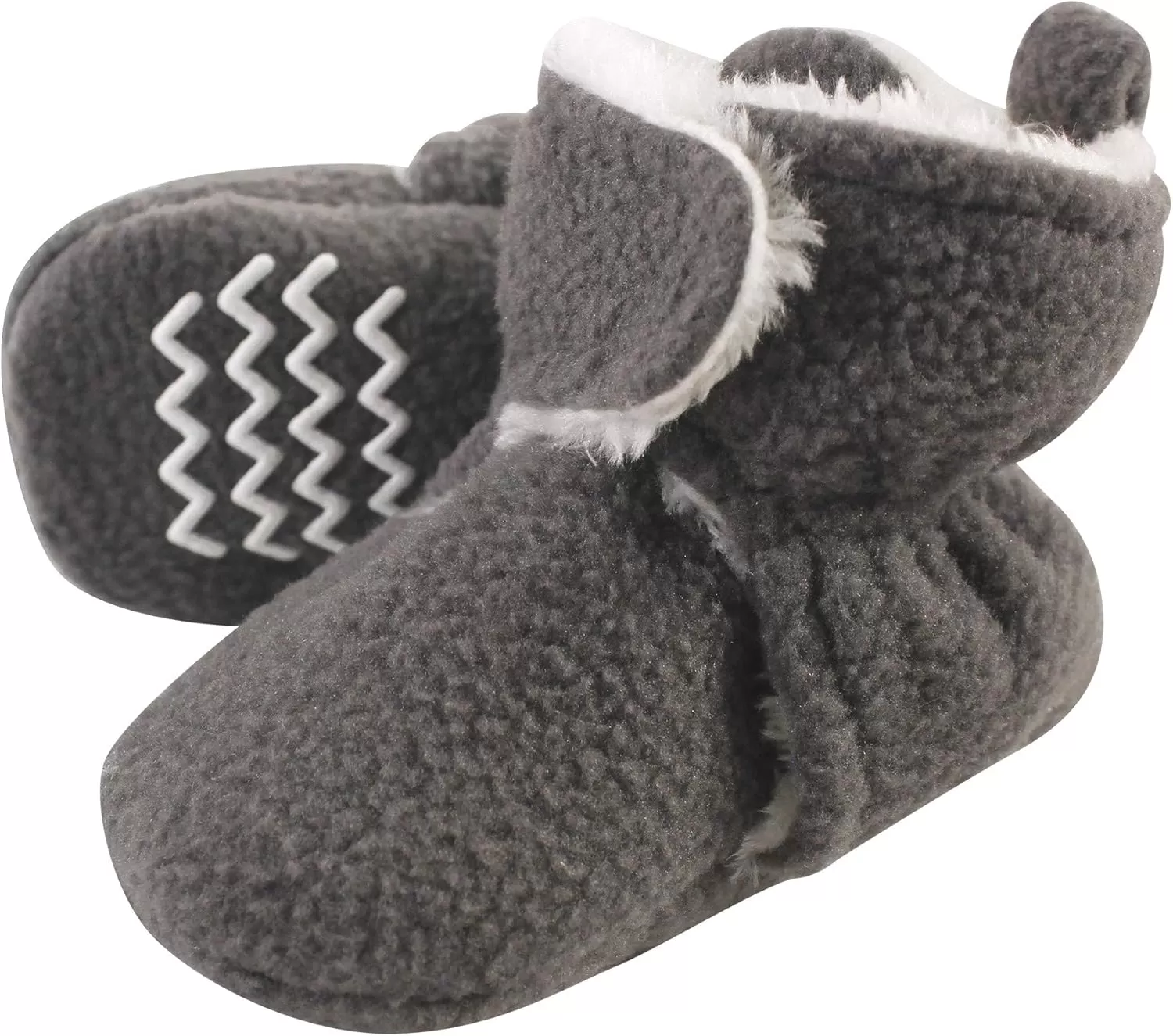 Hudson Baby fleece sherpa booties are comfortable, cozy baby booties made with fleece/sherpa material that will keep your little one's feet warm and comfortable. Our booties wrap around your baby's foot and fasten in the front with a velcro closure, so they are easy to put on, fasten and stay on. Our fleece/sherpa booties feature non-skid soles to prevent your baby from slipping and falling when they start to walk and run.