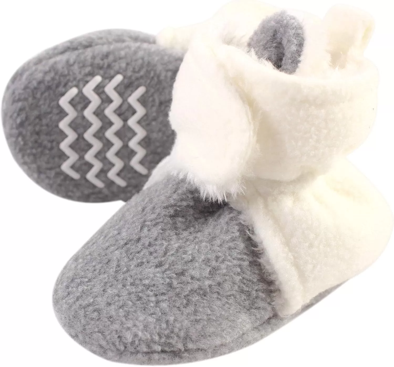 Hudson Baby fleece sherpa booties are comfortable, cozy baby booties made with fleece/sherpa material that will keep your little one's feet warm and comfortable. Our booties wrap around your baby's foot and fasten in the front with a velcro closure, so they are easy to put on, fasten and stay on. Our fleece/sherpa booties feature non-skid soles to prevent your baby from slipping and falling when they start to walk and run.