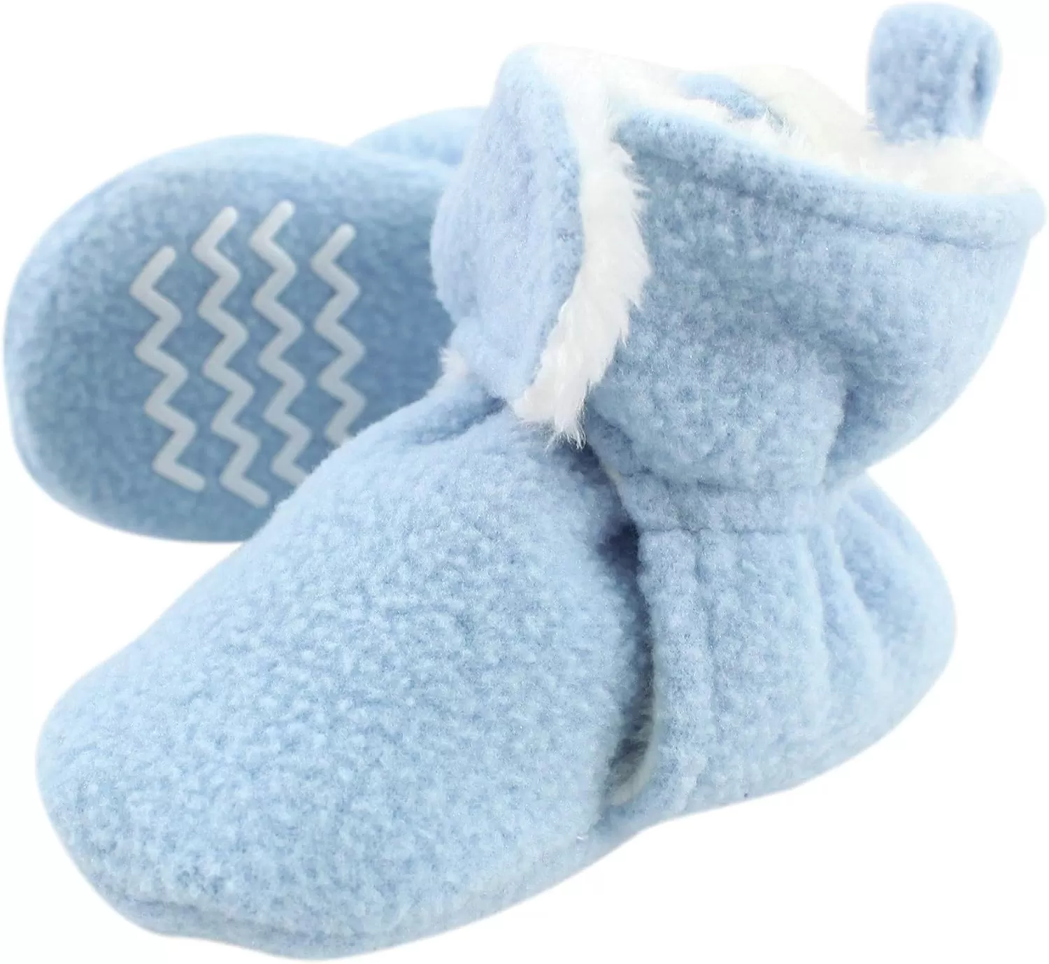 Hudson Baby fleece sherpa booties are comfortable, cozy baby booties made with fleece/sherpa material that will keep your little one's feet warm and comfortable. Our booties wrap around your baby's foot and fasten in the front with a velcro closure, so they are easy to put on, fasten and stay on. Our fleece/sherpa booties feature non-skid soles to prevent your baby from slipping and falling when they start to walk and run.