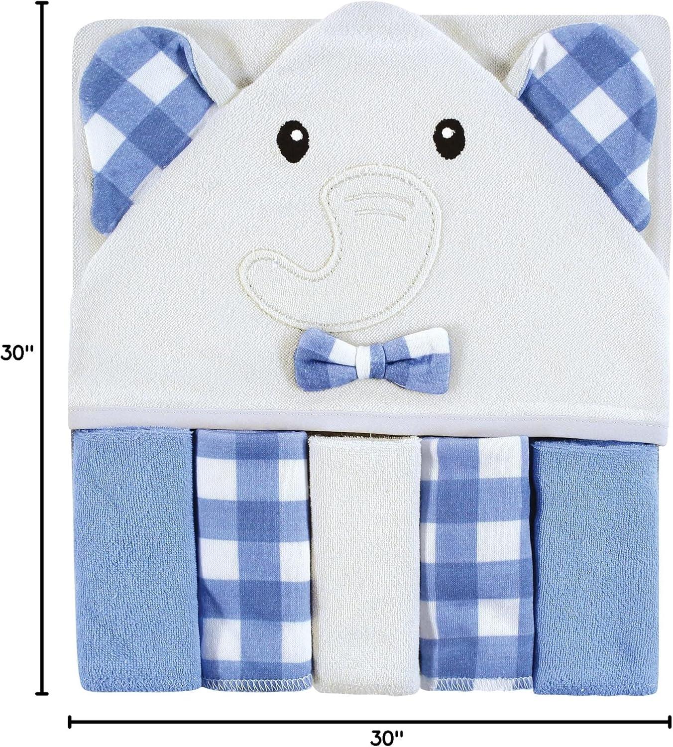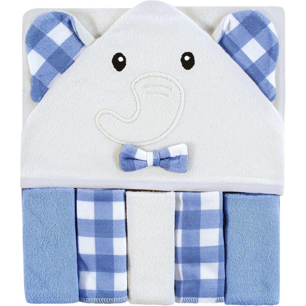 Hudson Baby Unisex Baby Hooded Towel and Five Washcloths, Modern Giraffe, One Size(Gingham Elephant)