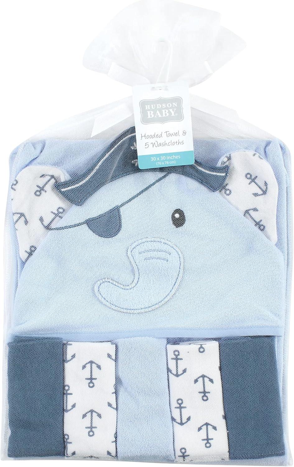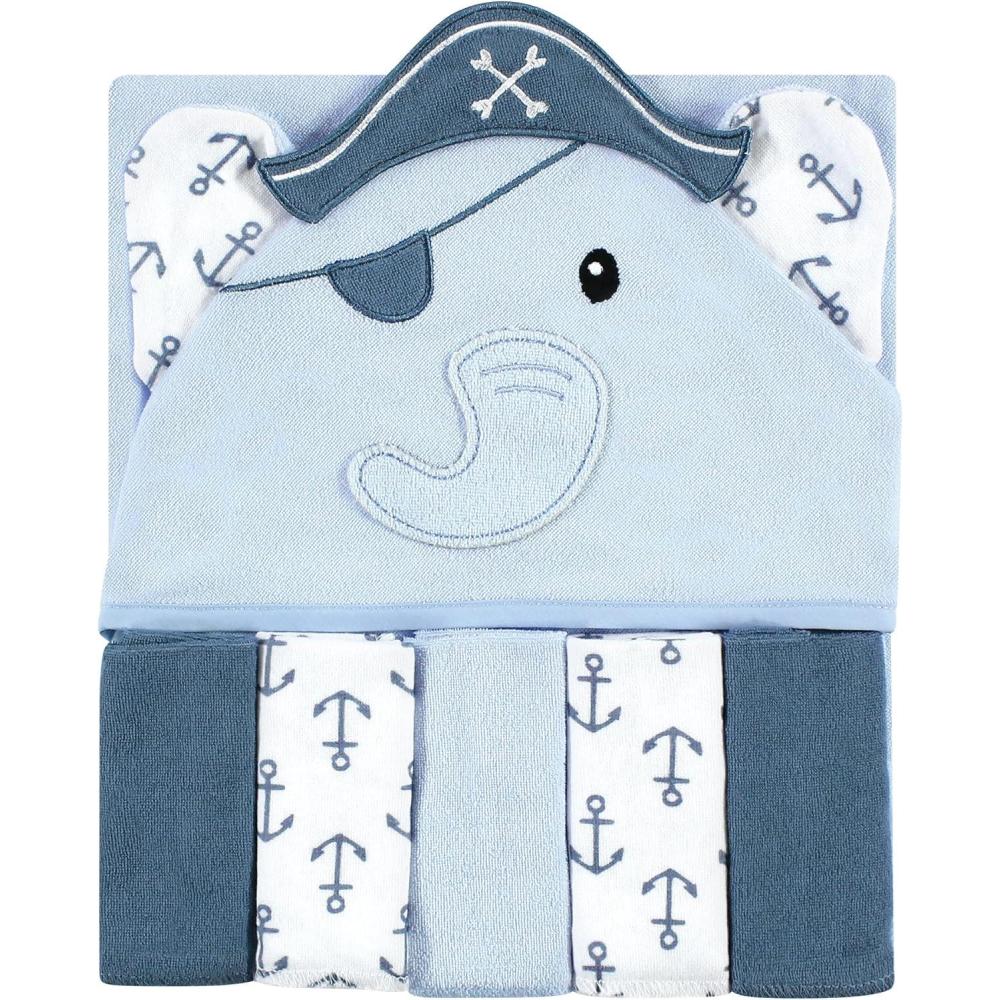 Hudson Baby Unisex Baby Hooded Towel and Five Washcloths, Modern Giraffe, One Size(Pirate Elephant)