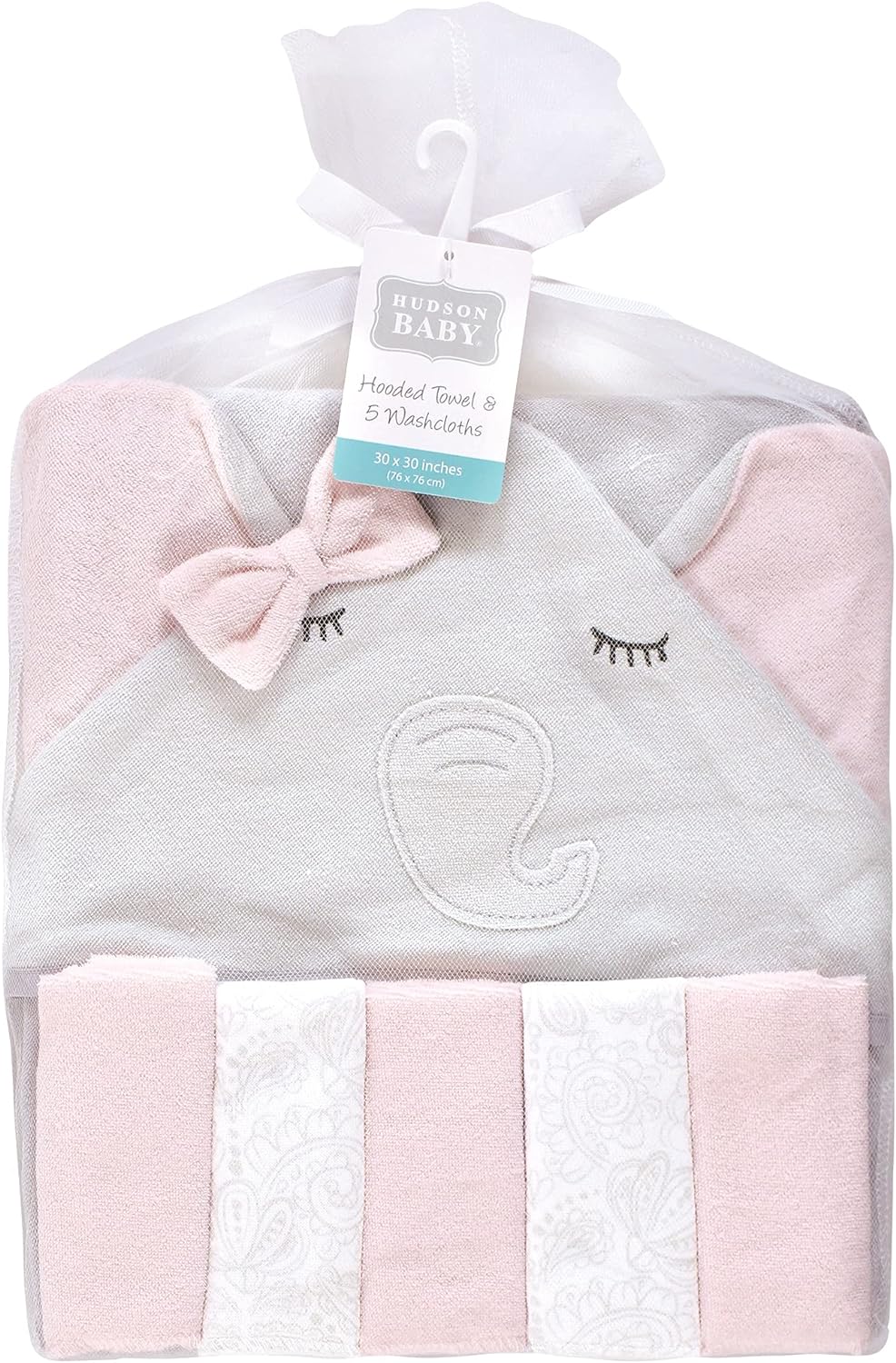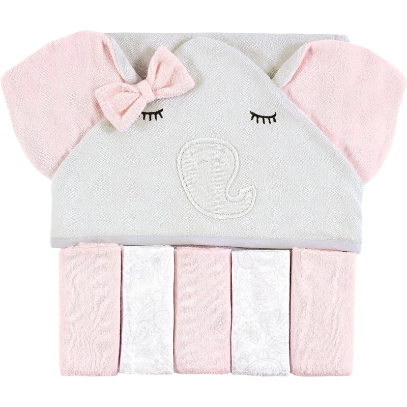 Hudson Baby Unisex Baby Hooded Towel and Five Washcloths, Yellow Duck, One Size(Gray Pink Elephant One Size)