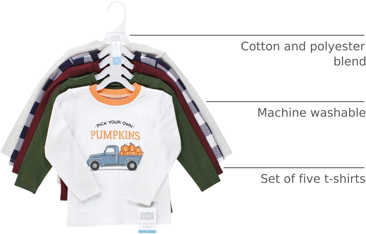 Hudson Baby t-shirts are great everyday tops for your little ones. Featuring fun prints and patterns, our t-shirts are made with comfortable, soft cotton poly fabric that feels wonderful on children's skin. Our sets include five t-shirts so you can mix and match with your child's wardrobe for fun everyday outfits.