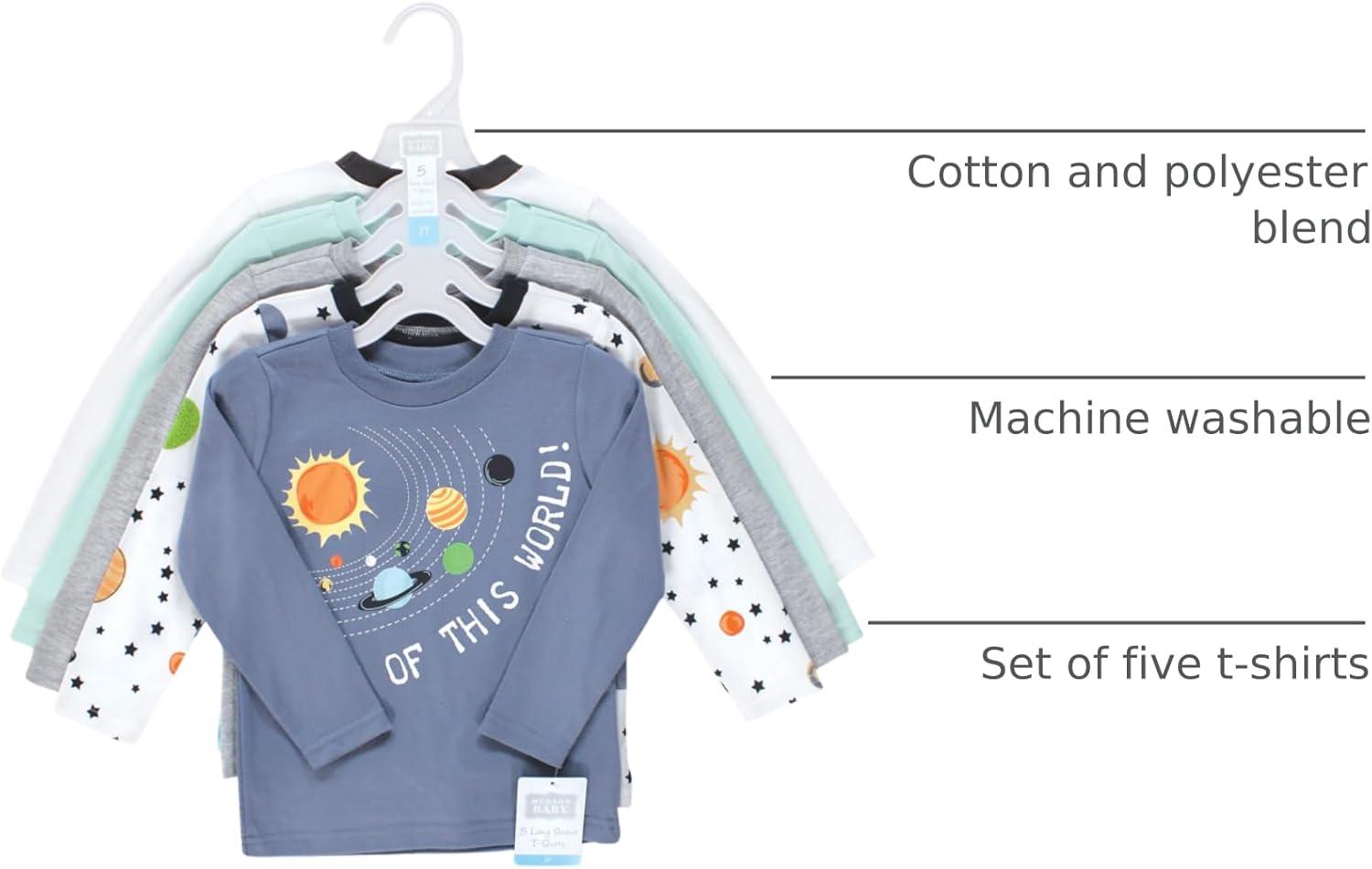 Hudson Baby t-shirts are great everyday tops for your little ones. Featuring fun prints and patterns, our t-shirts are made with comfortable, soft cotton poly fabric that feels wonderful on children's skin. Our sets include five t-shirts so you can mix and match with your child's wardrobe for fun everyday outfits.