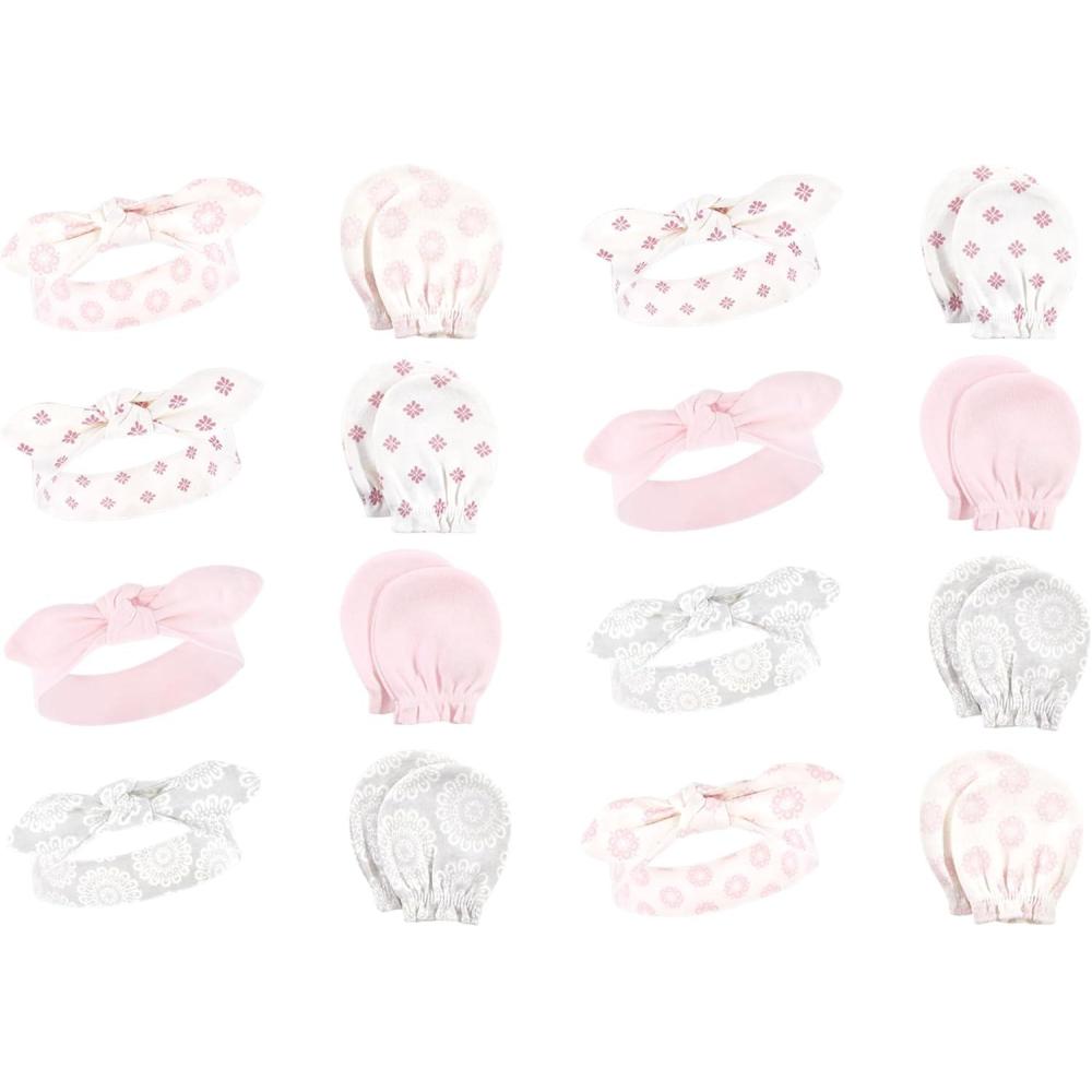 Hudson Baby headband and scratch mitten set is a perfect accessory set for your little girl. Each set comes with coordinating headbands and scratch mittens. Our headbands are a fun headwrap for your baby girl to look stylish with our adorable prints. Our scratch mittens are made with super soft cotton fabric and an elastic band around the wrist so the mittens stay on and protect your little one's face and body from any accidental scratches.