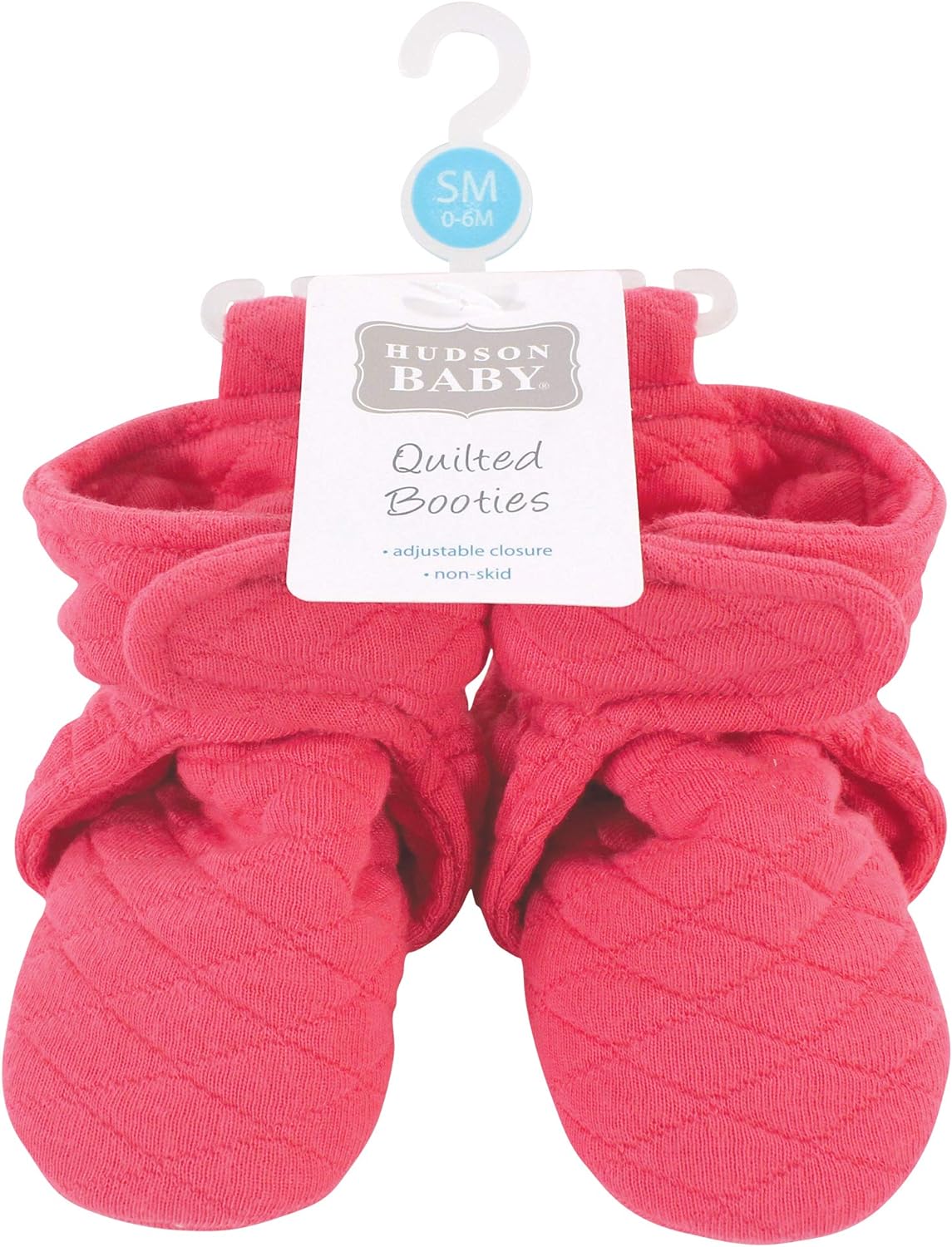 Hudson Baby quilted booties are comfortable, cozy baby booties made with quilted cotton material that will keep your little one's feet warm and comfortable. Our booties wrap around your baby's foot and fasten in the front with a velcro closure, so they are easy to put on, fasten and stay on. Our quilted booties feature non-skid soles to prevent your baby from slipping and falling when they start to walk and run.