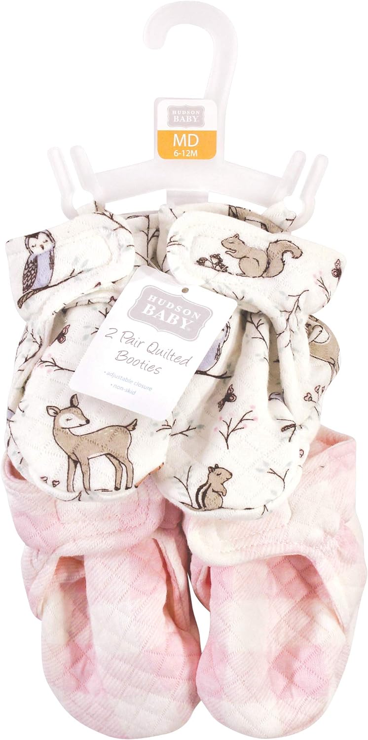 Hudson Baby quilted booties are comfortable, cozy baby booties made with quilted cotton material that will keep your little one's feet warm and comfortable. Our booties wrap around your baby's foot and fasten in the front with a velcro closure, so they are easy to put on, fasten and stay on. Our quilted booties feature non-skid soles to prevent your baby from slipping and falling when they start to walk and run.