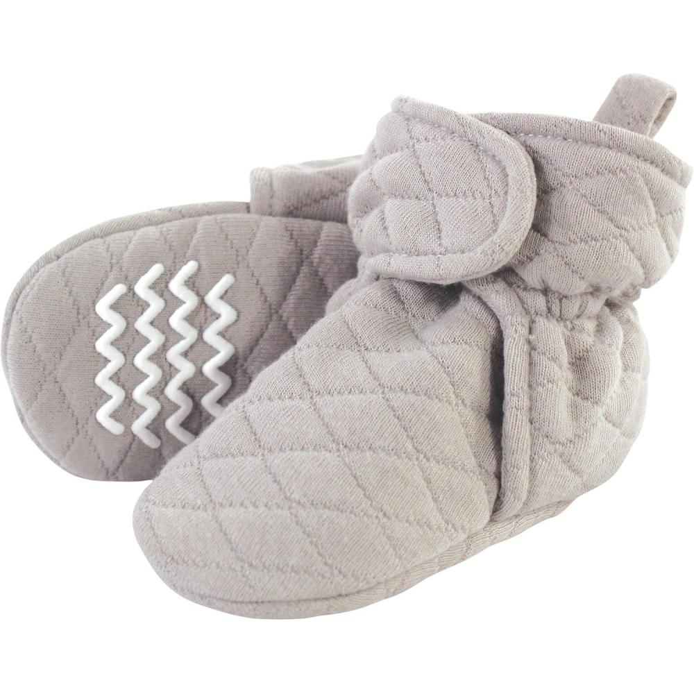 Hudson Baby quilted booties are comfortable, cozy baby booties made with quilted cotton material that will keep your little one's feet warm and comfortable. Our booties wrap around your baby's foot and fasten in the front with a velcro closure, so they are easy to put on, fasten and stay on. Our quilted booties feature non-skid soles to prevent your baby from slipping and falling when they start to walk and run.
