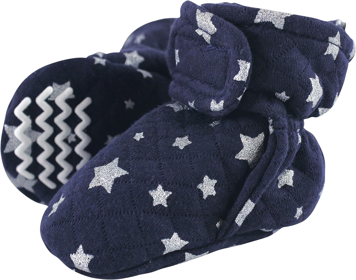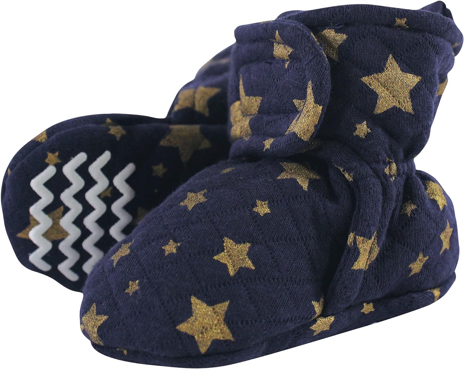 Hudson Baby quilted booties are comfortable, cozy baby booties made with quilted cotton material that will keep your little one's feet warm and comfortable. Our booties wrap around your baby's foot and fasten in the front with a velcro closure, so they are easy to put on, fasten and stay on. Our quilted booties feature non-skid soles to prevent your baby from slipping and falling when they start to walk and run.