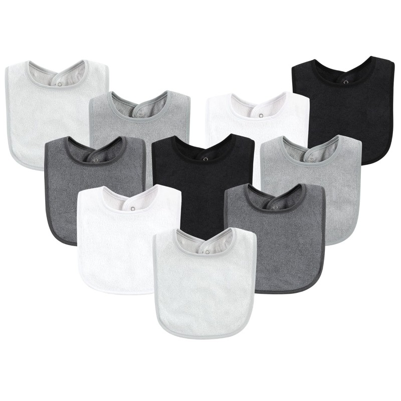 Hudson Baby soft and absorbent rayon drooler bibs are the perfect value pack to cover all your bib needs. These bibs are super soft cotton blend material on the front and have a waterproof backing to protect baby's clothes from heavy drool! These bibs have a hook and loop closure on the back of neck and measure about 6 inches from neck to bottom. With a variety of colors, you'll find the perfect one for daily mix and match with outfits!