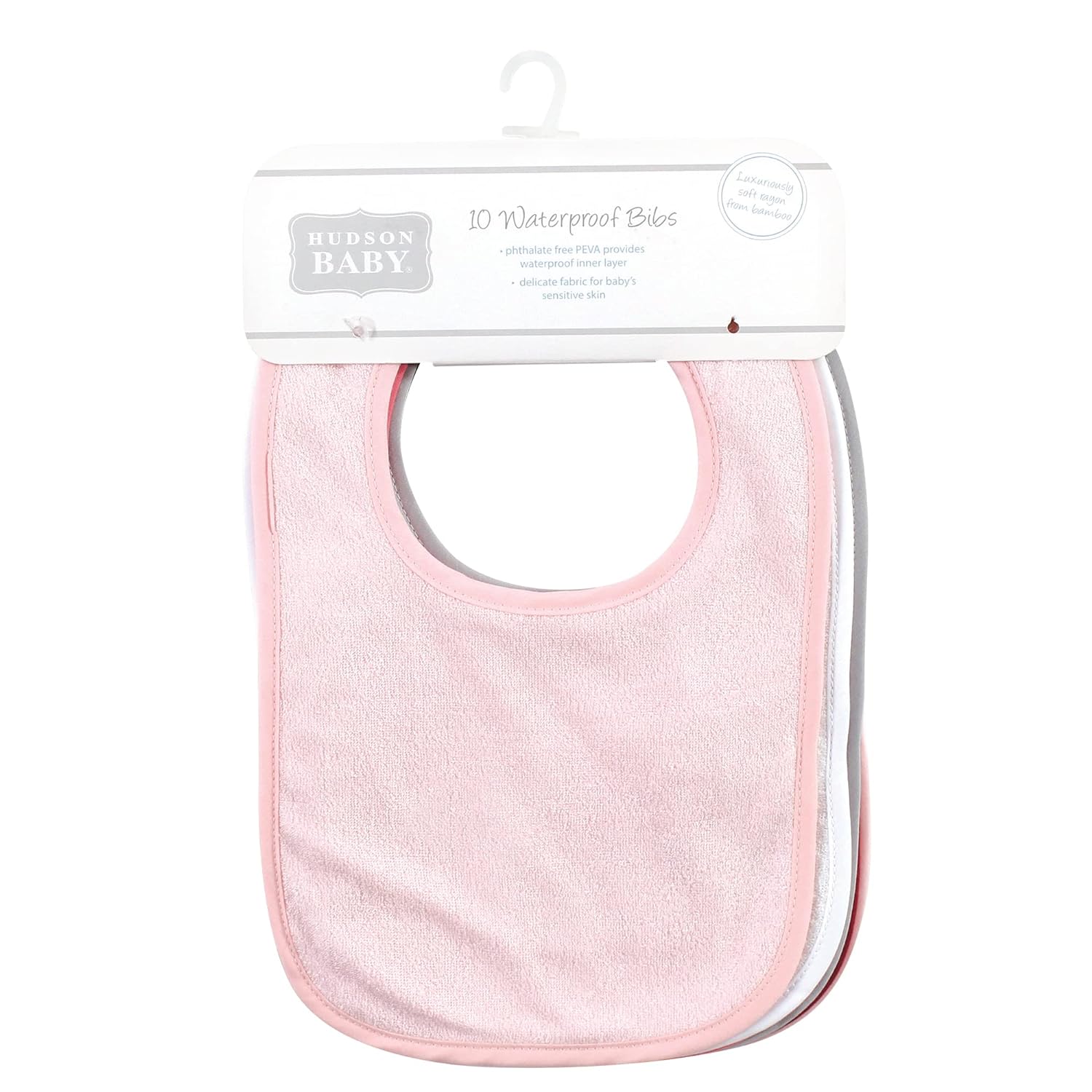 Hudson Baby soft and absorbent rayon drooler bibs are the perfect value pack to cover all your bib needs. These bibs are super soft cotton blend material on the front and have a waterproof backing to protect baby's clothes from heavy drool! These bibs have a hook and loop closure on the back of neck and measure about 6 inches from neck to bottom. With a variety of colors, you'll find the perfect one for daily mix and match with outfits!