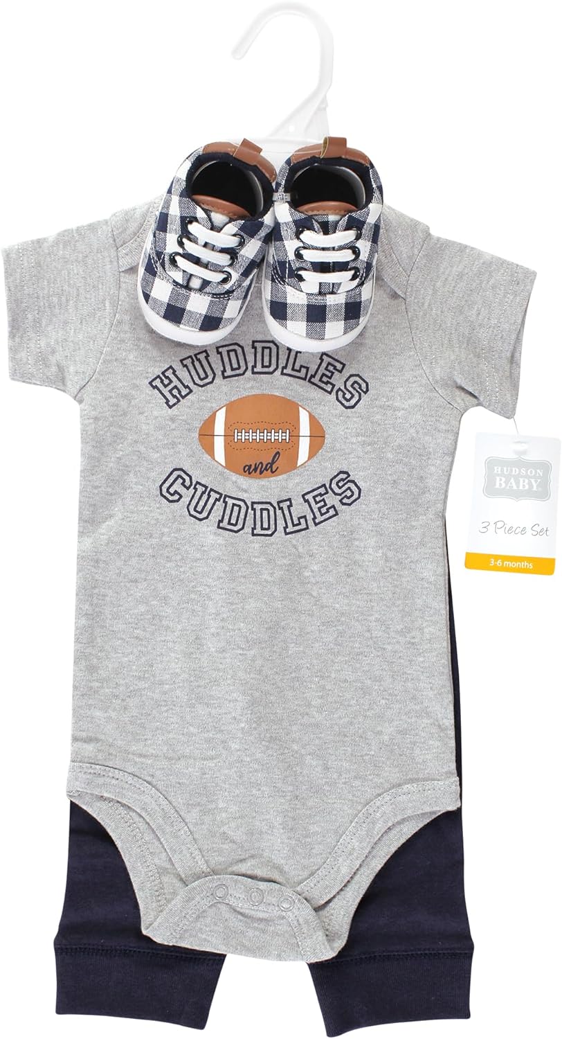 Hudson Baby Unisex Baby Unisex Baby Cotton Bodysuit, Pant and Shoe Set, Football Huddles, 9-12 Months