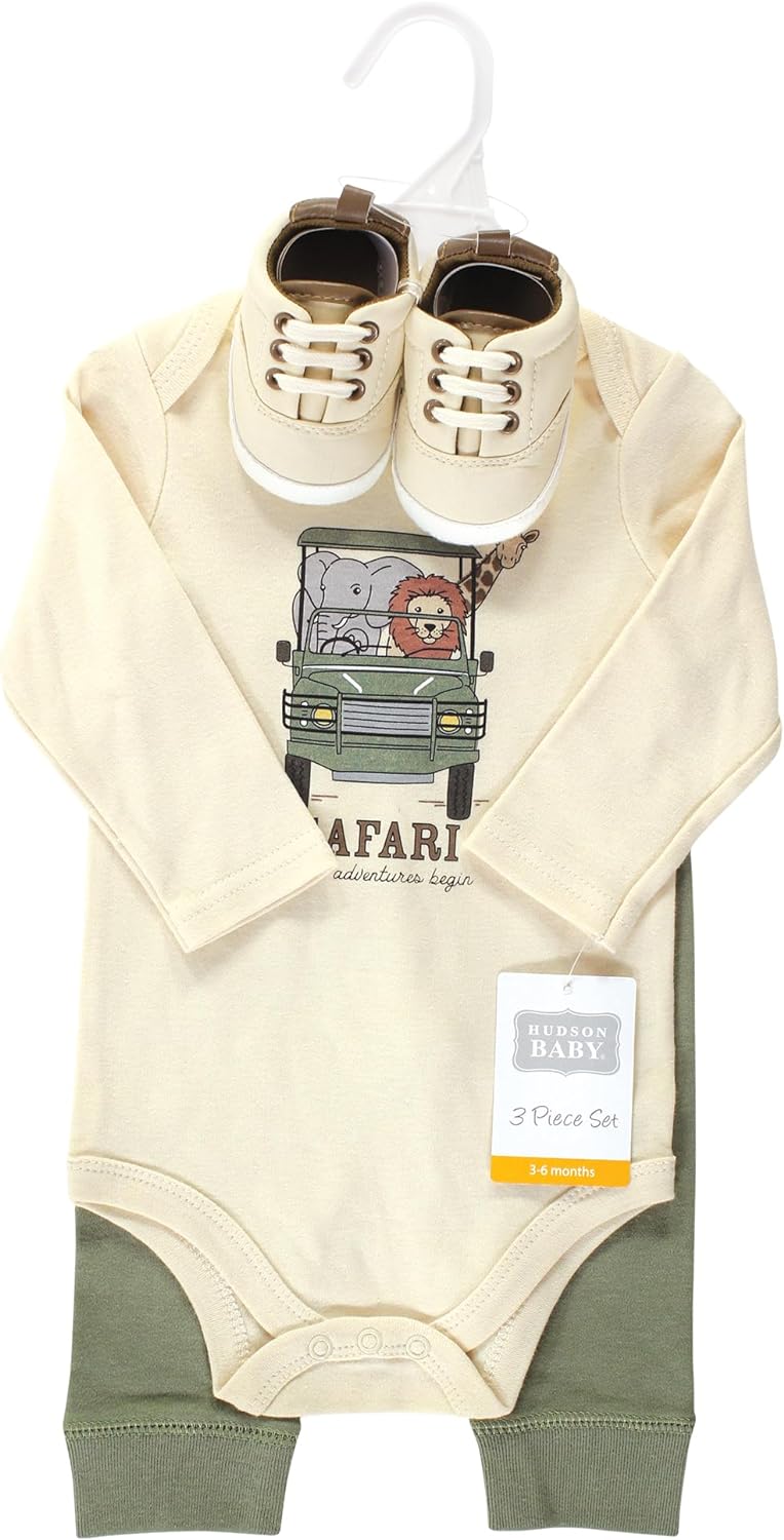 Hudson Baby Unisex Baby Unisex Baby Cotton Bodysuit, Pant and Shoe Set, Going on Safari, Newborn