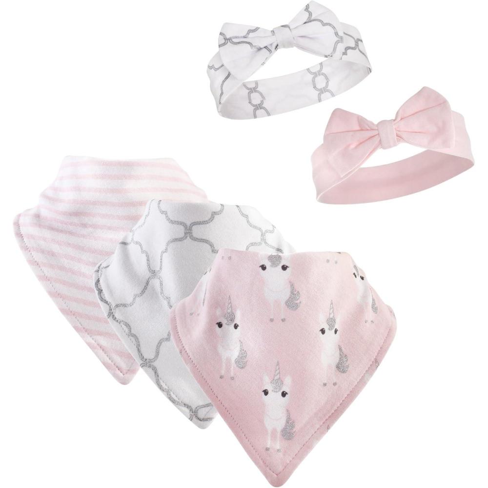 Hudson Baby Unisex BabyCotton Bib and Headband or Caps Set(Pink Unicorn)