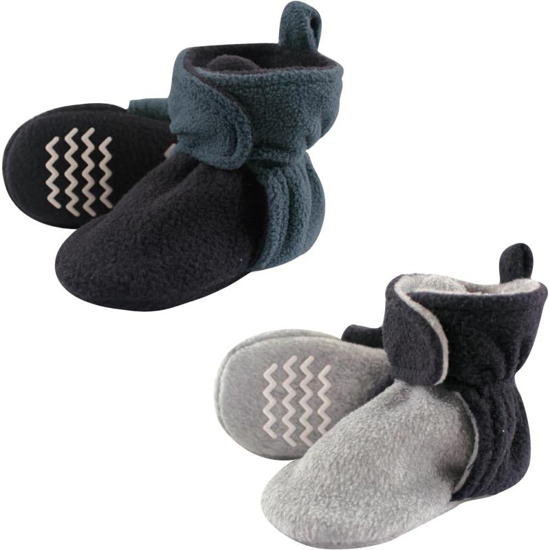 Hudson Baby fleece booties are comfortable, cozy baby booties made with fleece material that will keep your little one's feet warm and comfortable. Our booties wrap around your baby's foot and fasten in the front with a velcro closure, so they are easy to put on, fasten and stay on. Our fleece booties feature non-skid soles to prevent your baby from slipping and falling when they start to walk and run.