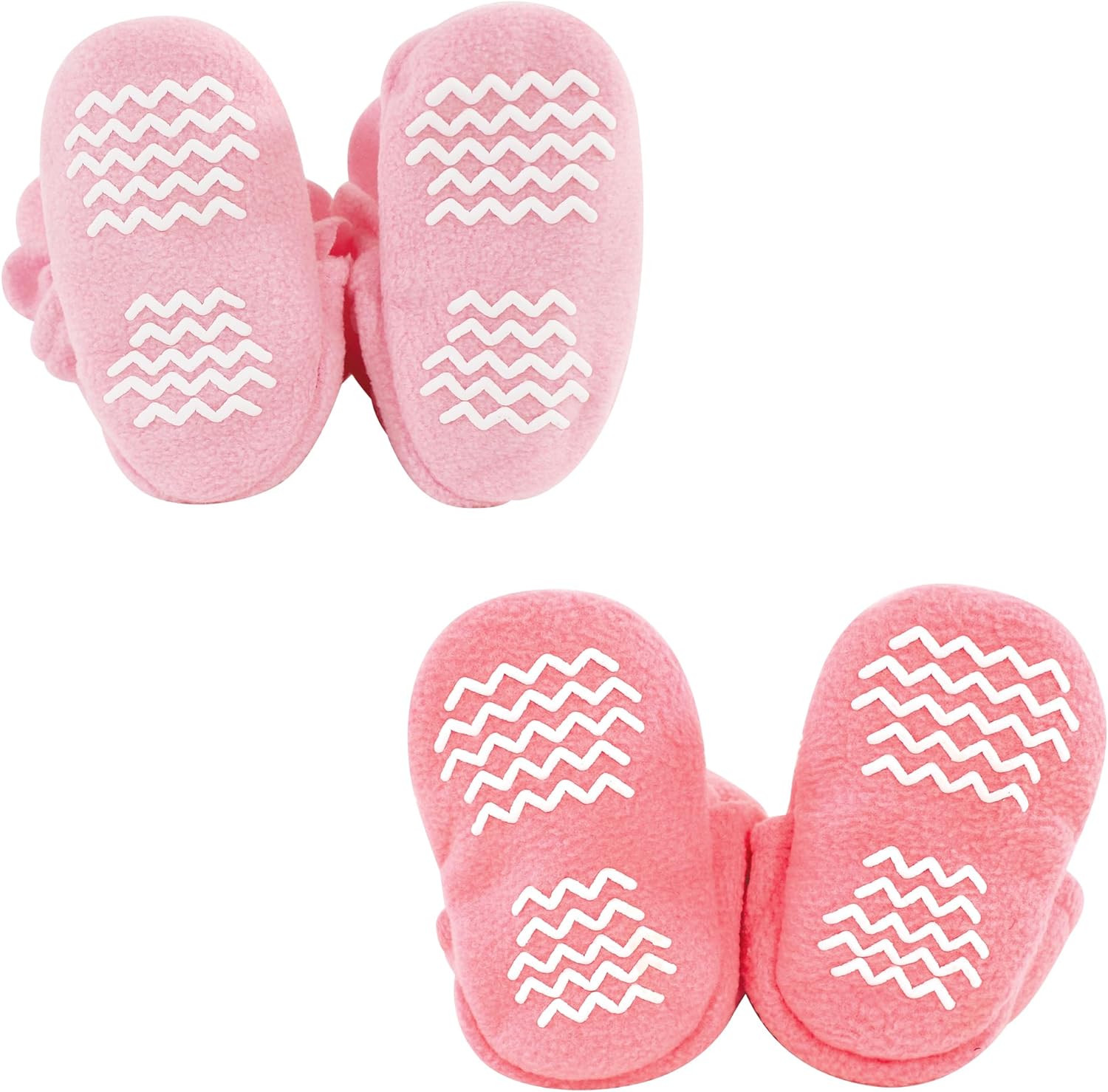 Hudson Baby fleece booties are comfortable, cozy baby booties made with fleece material that will keep your little one's feet warm and comfortable. Our booties wrap around your baby's foot and fasten in the front with a velcro closure, so they are easy to put on, fasten and stay on. Our fleece booties feature non-skid soles to prevent your baby from slipping and falling when they start to walk and run.