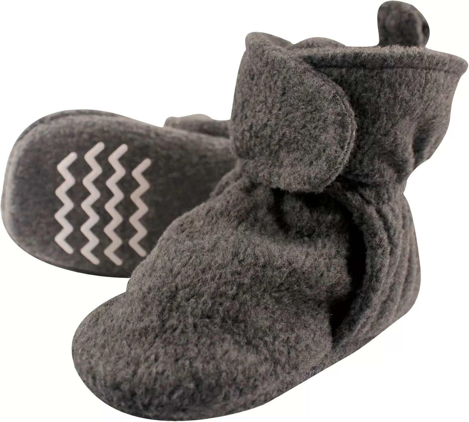 Hudson Baby fleece booties are comfortable, cozy baby booties made with fleece material that will keep your little one's feet warm and comfortable. Our booties wrap around your baby's foot and fasten in the front with a velcro closure, so they are easy to put on, fasten and stay on. Our fleece booties feature non-skid soles to prevent your baby from slipping and falling when they start to walk and run.