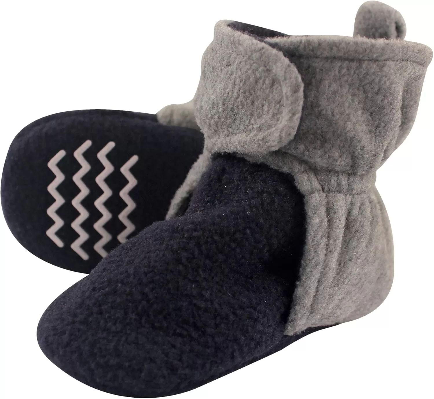 Hudson Baby fleece booties are comfortable, cozy baby booties made with fleece material that will keep your little one's feet warm and comfortable. Our booties wrap around your baby's foot and fasten in the front with a velcro closure, so they are easy to put on, fasten and stay on. Our fleece booties feature non-skid soles to prevent your baby from slipping and falling when they start to walk and run.