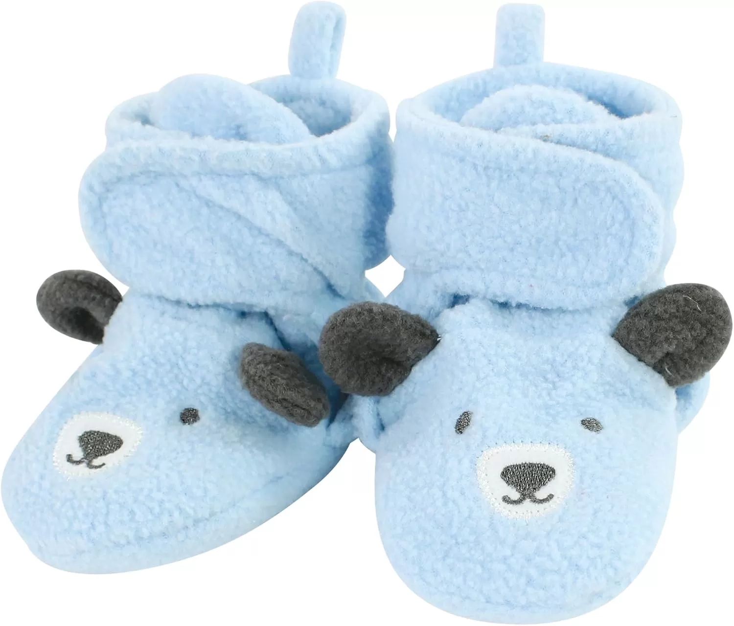 Hudson Baby fleece booties are comfortable, cozy baby booties made with fleece material that will keep your little one's feet warm and comfortable. Our booties wrap around your baby's foot and fasten in the front with a velcro closure, so they are easy to put on, fasten and stay on. Our fleece booties feature non-skid soles to prevent your baby from slipping and falling when they start to walk and run.