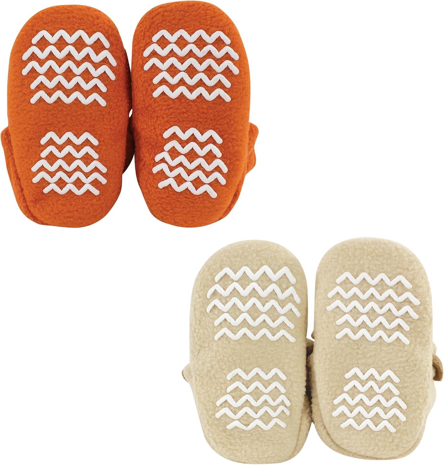 Hudson Baby fleece booties are comfortable, cozy baby booties made with fleece material that will keep your little one's feet warm and comfortable. Our booties wrap around your baby's foot and fasten in the front with a velcro closure, so they are easy to put on, fasten and stay on. Our fleece booties feature non-skid soles to prevent your baby from slipping and falling when they start to walk and run.