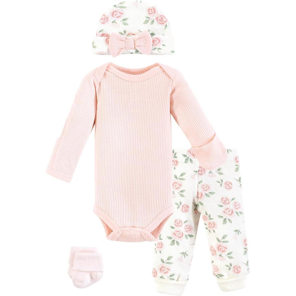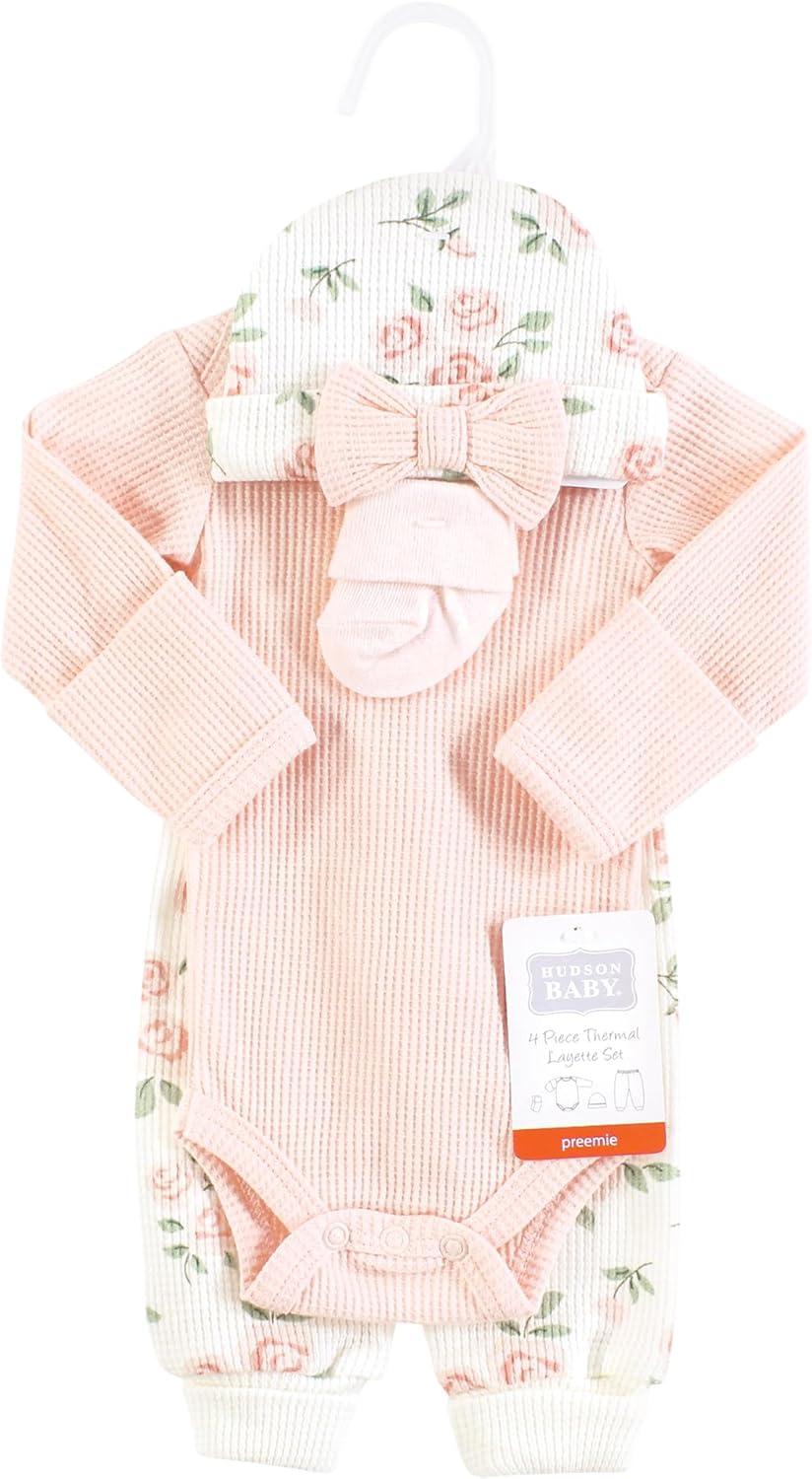 Hudson Baby Unisex Thermal Preemie Layette Set 4pc Long Sleeve Outfit(Soft Pink Sage Rose)