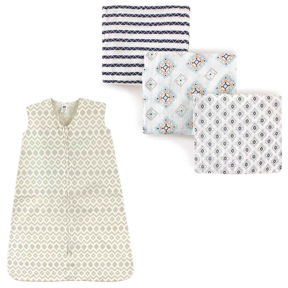 Set includes three muslin swaddle blankets and a wearable jersey cotton “safe sleep” sleeping bag