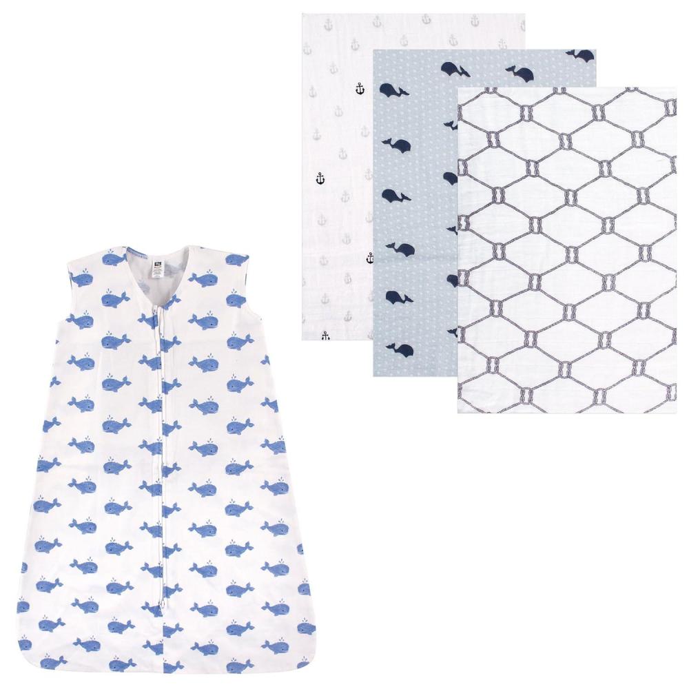 Muslin Swaddle Blanket 3-Pack & Wearable Cotton Jersey Sleeping Bag(Whale/Whale)
