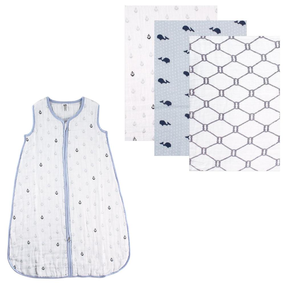 Set includes three muslin swaddle blankets and a wearable “safe sleep” sleeping bag